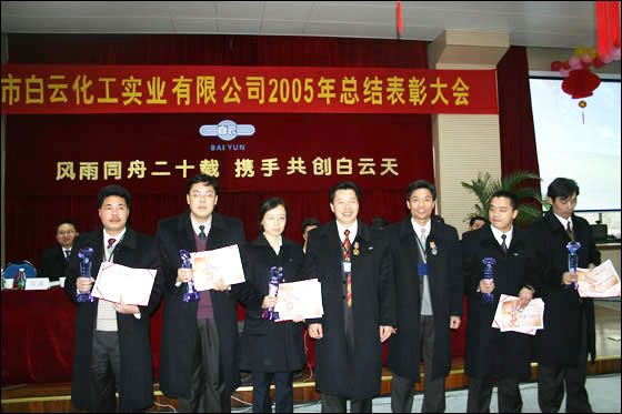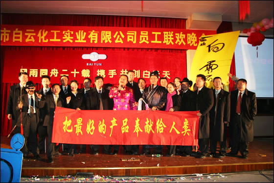 2006年1月8日,广州市白云化工实业有限公司迎来了新厂房搬迁暨建厂二十周年大庆的“好日子”。从广州市民营科技园门前北太大道到白云化工新厂房沿路均插满了五颜六色的彩旗,新厂房上空飘动着七彩的汽球,公司门前双龙拱门作装饰,公司院内铺着迎宾的红色的地毯、办公大楼门前放着花篮。满面笑容的