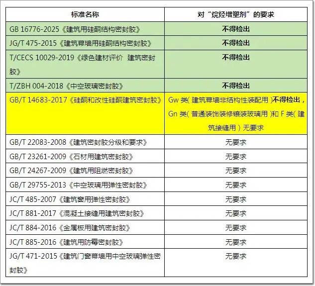 所以2015年以后,逐渐有密封胶标准对密封胶中的白油含量做出明确限制。当前密封胶标准对烷烃增塑剂含量的要求如表1所示。