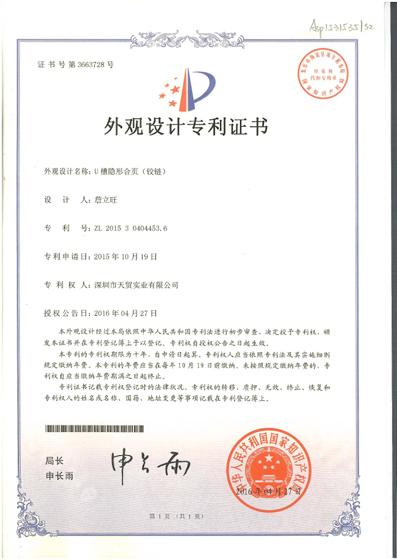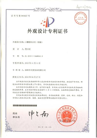 U槽隐形合页-外观设计专利证书1 |