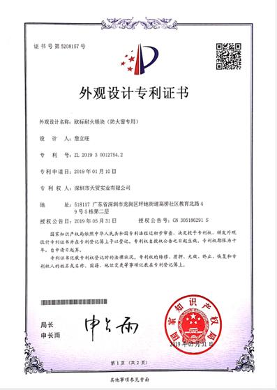 欧标耐火锁块-外观设计专利证书 |