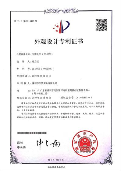 方钢执手-外观设计专利证书 |