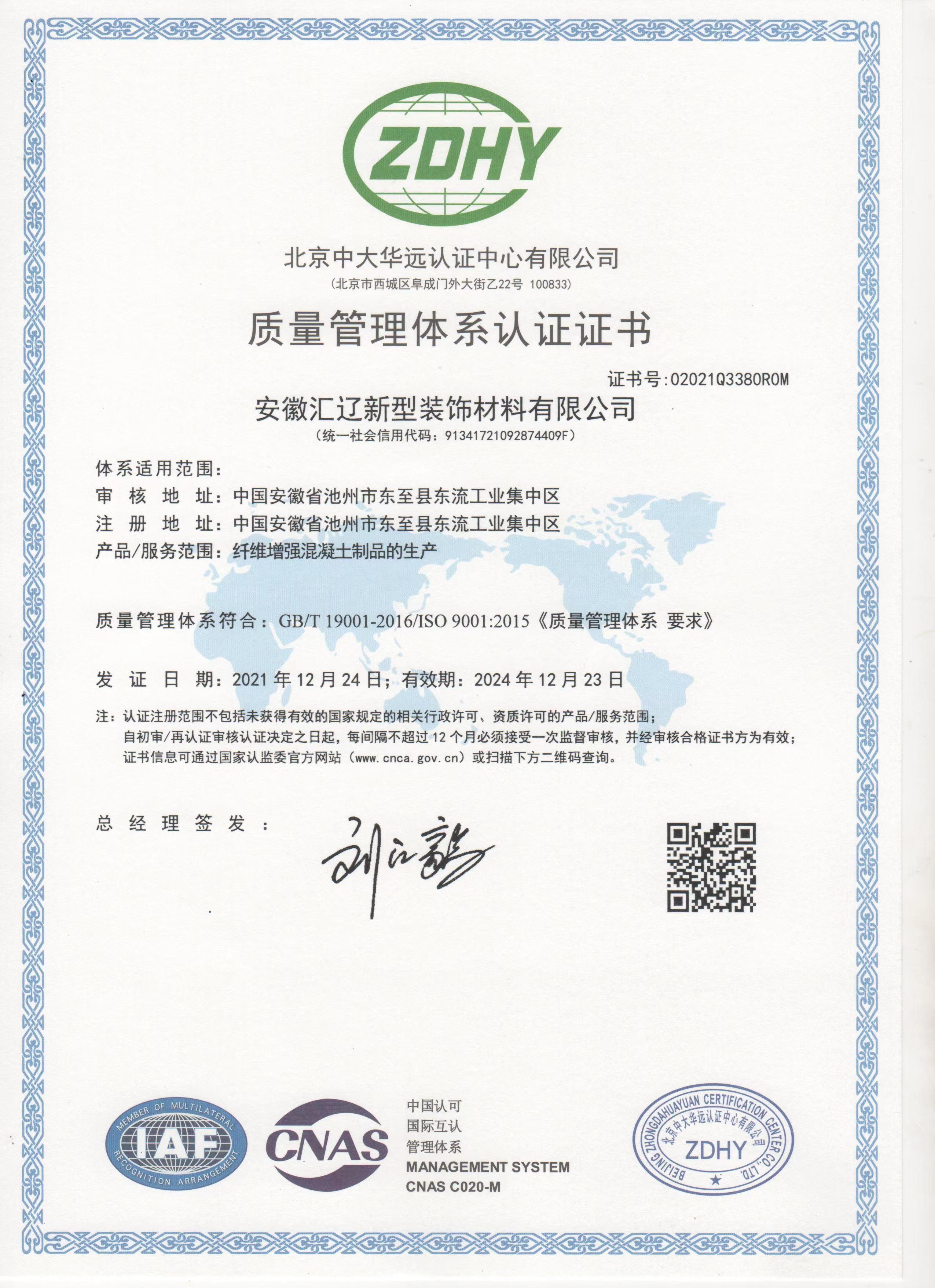 质量管理体系认证证书