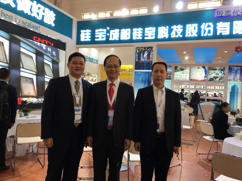 中国建筑金属结构协会会长郝际平(中),与硅宝科技总经理周文亮(左一)、市场总监王有强(右一)合影