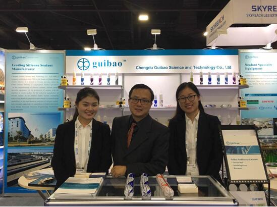 硅宝科技美洲事务首席代表郭越(中)、市场总监吴静(左)及海外部负责人郑英亮相“2017美国国际玻璃门窗展览会”