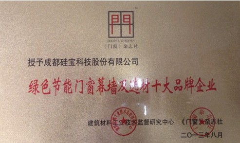 日前,建筑材料工业技术监督研究中心、《门窗》杂志社联合授予成都硅宝科技股份有限公司“绿色节能门窗幕墙及选材十大品牌企业”称号。