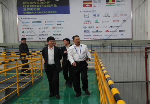 硅宝总经理王有治带领成都市质量技术监督局局长王道明(左一)等一行现场考察