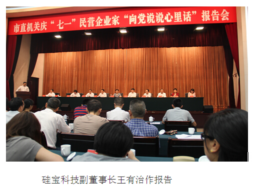 2014年7月1日,成都市直机关工委、市工商联联合举办的”市直机关庆‘七一’民营企业家‘向党说说心里话’报告会在市委第三办公区小礼堂举行。硅宝科技副董事长王有治等7位知名民营企业家走进机关,从不同角度、不同方面向市直机关300余名党员代表作了生动感人的专题报告,广泛宣传了民营经济为成都市做出的重要贡献,鼓励、支持民营经济发展,引导民营企业家深入开展理想信念教育实践活动。市委常委、统战部部长陈建辉出席并讲话。