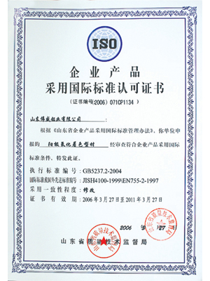 企业产品采用国际标准认可证书 |