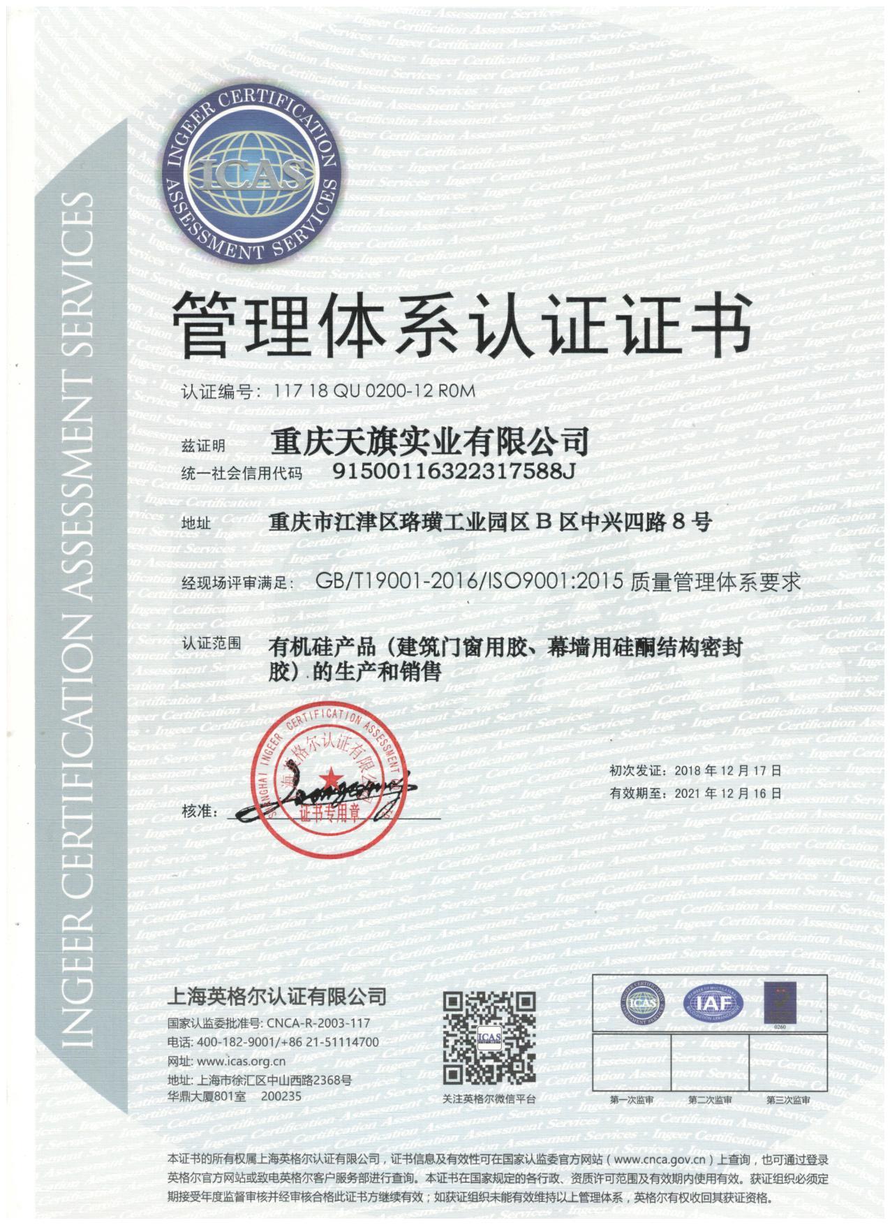 证书名称: 质量体系管理要求