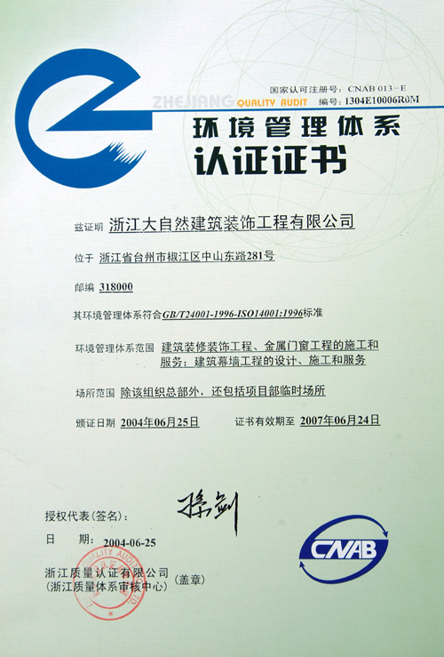 环境管理体系认证证书 |