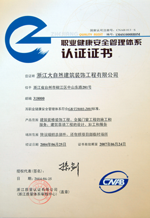 职业健康安全管理体系认证证书 |