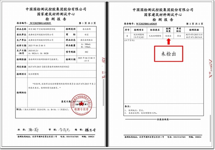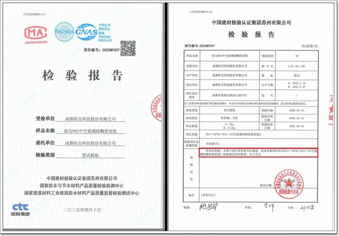 附1:国家权威检测机构出具的硅宝882中空玻璃(词条“中空玻璃”由行业大百科提供)硅酮密封胶检测报告,产品性能符合国家标准,无白油。