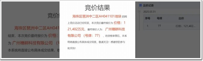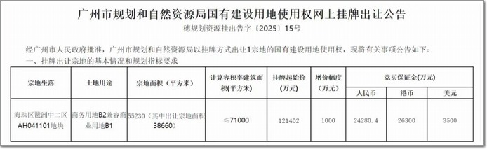 2025年4月,广州交易集团有限公司(广州公共资源交易中心)披露,广州穗耕科技有限公司以12.14亿元的总价,拿下了广州海珠区琶洲中二区AH041101地块,总面积5.52万平方米,商业使用租期40年、综合或其他使用租期则为50年。