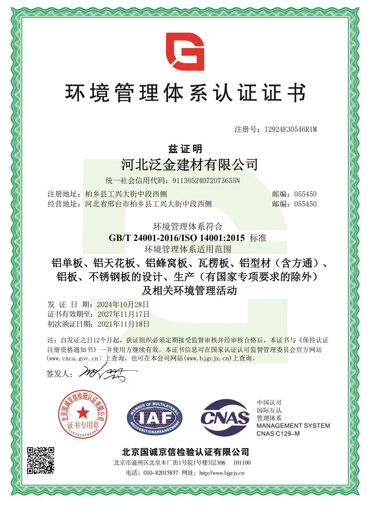 环境管理体系认证证书