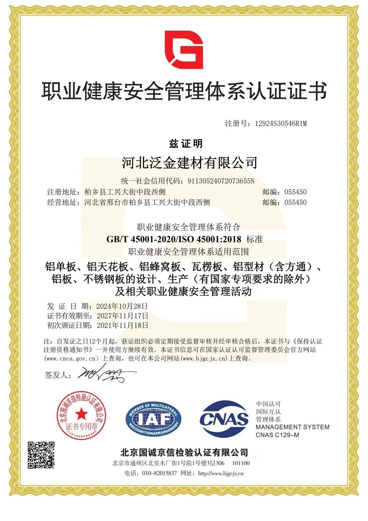 职业健康安全管理体系认证证书