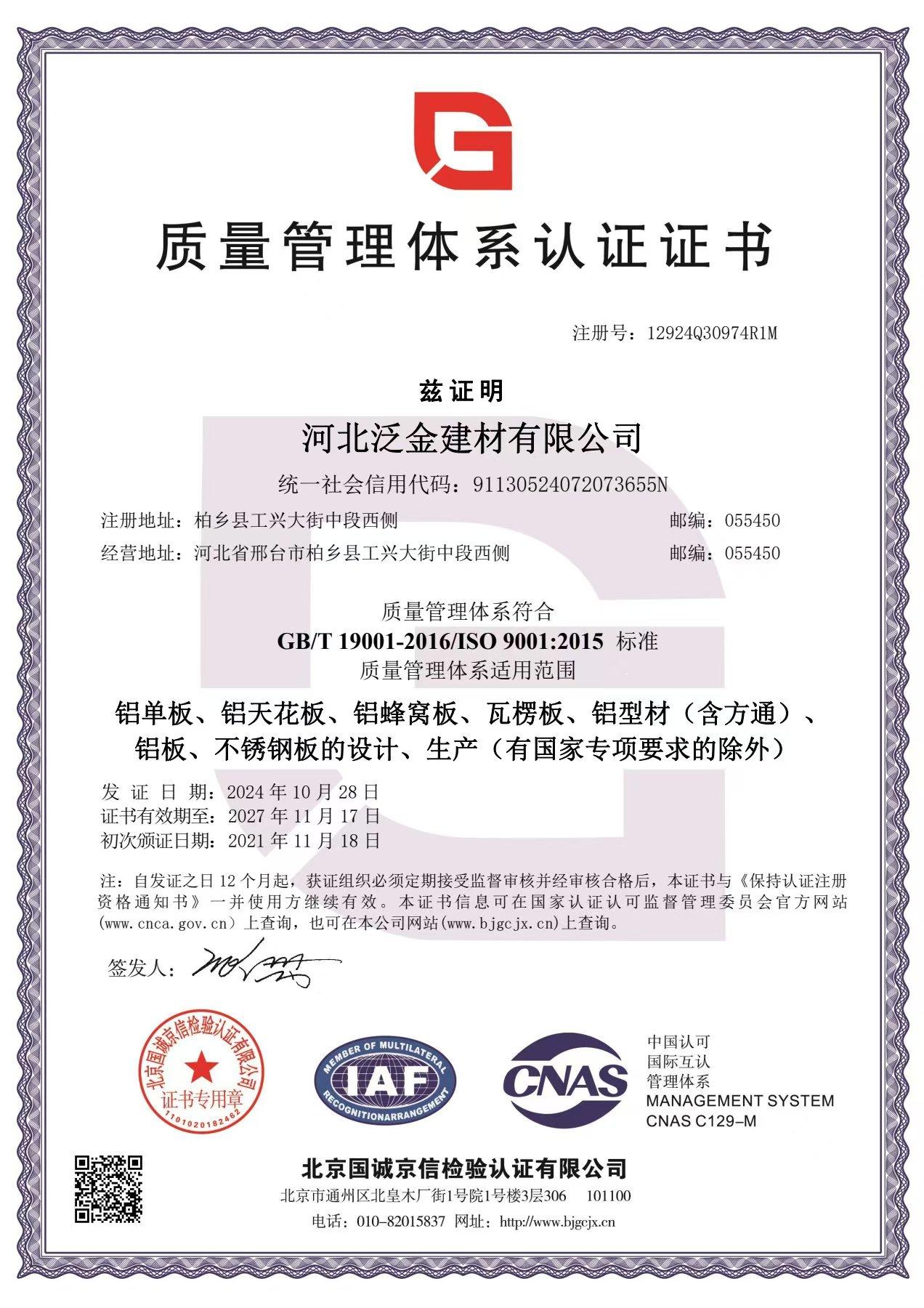 质量管理体系认证证书
