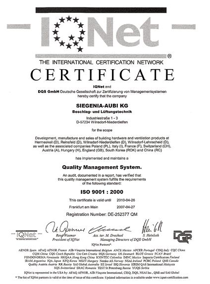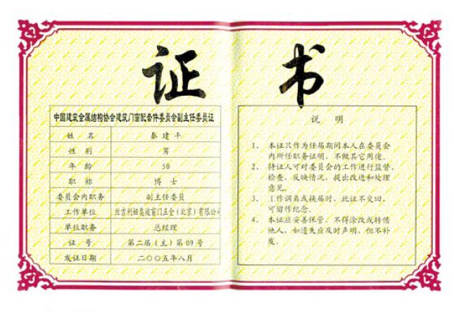 中国建筑金属结构协会建筑门窗配套件委员会副主任委员证