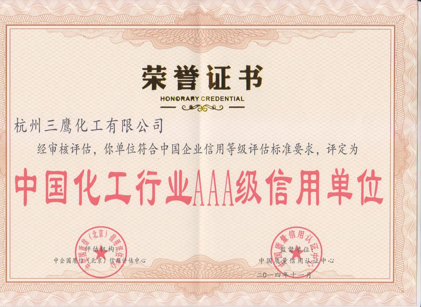 2014年11月,杭州三鹰化工有限公司被中国质量信用认证中心评定为中国化工行业AAA级