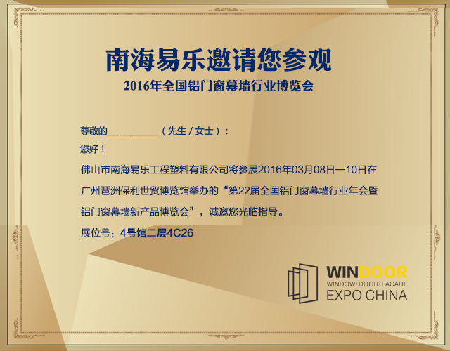 南海易乐邀请您参观2016年全国铝门窗幕墙行业博览会