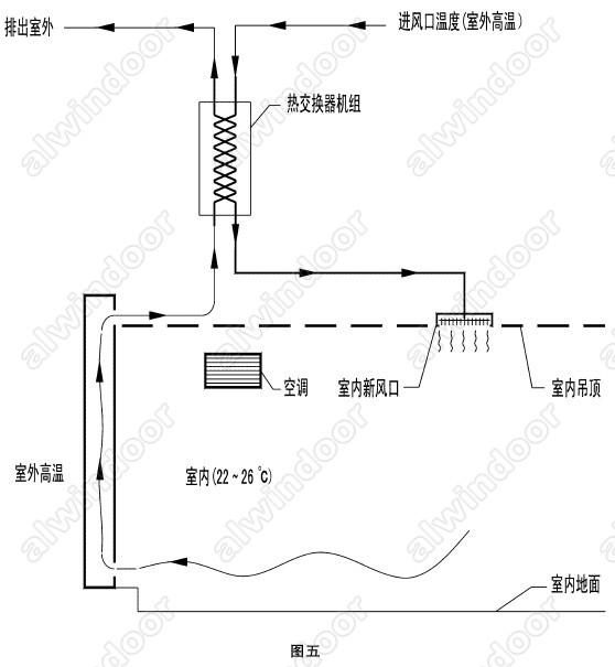 交换式内循环双层幕墙夏季炎热时工作原理是室内气体经图示线路从双层幕墙进气口(下口)进入双层内腔,经内腔后从幕墙上面出口经管道进入热交换机组,此时室内与经外部进气口进入热交换机组的新风进行能量交换后,出去的风经排风管道排出建筑外部,进入室内的新风通过建筑内管道、室内顶棚的风口进入室内。在这个热交换过程中,当夏季室外炎热高温时,室内被排出去的温度较低(与室外比)的空气在经过热交换器的时候,与进风口进来的高温新风进行热交换,把高温新风的热量带走,这样进人室内的新风的温度就降下来了。减少了夏季室内空调制冷的负荷。同时从遮阳的角度考虑,双层幕墙由于设置了遮阳帘系统,所以通过遮阳也能起到一定的节能作用。