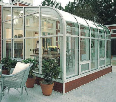 拜占庭式的阳光房,连接墙体和地面的,是一整个巨大的弧面。弧形,恐怕是最能给人遐想的形状了。在弧顶阳光房里,似乎将空间隔开的,并不是冷冰冰的玻璃,而只是一弯优雅柔美的线条。 特点:造型时尚优美,门窗开启方式灵活多样。 适合区域:别墅花园或露台、多层及小高层公寓房的较大露台(必须有一定宽度)。 适用功能:饮茶、健身、二人世界。