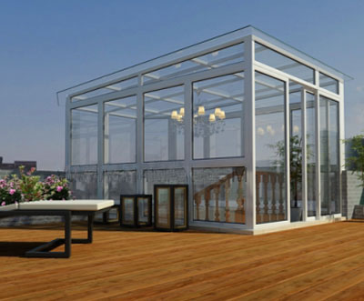 结构组成:立面采用单玻塑钢门窗(或者双玻塑钢门窗), 顶面采用彩铝方管框架结合8mm钢化玻璃(或者5+5夹胶玻璃,5+5单面钢化夹胶玻璃,5+5双面钢化夹胶玻璃)。