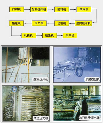 生产工艺 1、基材的加工 将一定量的矿棉放入容器中加水搅拌,使棉与渣球分离,渣球沉于底部,捞出矿棉,再洗涤一次后将棉干水分并称量。有时矿棉也用造粒机分解成粒状棉后再使用,将粘胶剂、防水剂等添加剂按配比混合搅拌成料浆,成型在长网抄取机上进行,料浆经滤水、真空吸水、挤压成为一定厚度毛坯,切割后烘干即成矿棉基板。 2、装饰加工 盲孔加工:用半成品经滚压轧出大小形状不同的不透孔,增加吸音效果,再进行板边精加工,着色,烘干即为成品。 沟槽型板的加工:盲孔板经专门的铣削机分别加工出纵横两方向的沟槽,或铣出圆形,着色,烘干即成。印刷型板的加工:半成品通过印刷机上的模板,涂上预先配好的涂料,印出各种花纹图案,在花纹上也可撒上细砂,再经烘干而成。浮雕型板的加工:半成品着色后,通过装有浮雕型板的压力机压出各种花纹,然后再经切割开榫制成。浮雕型板是专业厂制造的,加工费用高。 工艺流程 矿棉疏松、磨纸打浆、混料搅拌、进恒位槽、放浆上网、成型、进室烘干、出板切割(2.4m锯成 1.2m)打腻子、烘干、喷涂、压花、切割(600mmX600mm)、喷涂背胶、包装入库。其生产出的矿棉板以高品质粒状棉为主要原料矿棉,不含对人体有害成份,是一种安全环保型绿色建材产品。
